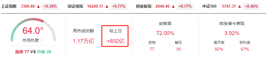 沪指放量上涨0.38% 微盘股、北证50指数齐创历史新高!大消费、医药概念全线爆发。三大指数全天上行,截至收盘,沪指涨0.38%,深证成指涨0.77%,创业板指涨0.77%。北证50指数涨1.22%,创下历史新高。两市个股涨多跌少,上涨个股超3800只;两市全天成交1.17万亿元,较上一日放量成交832亿元,内资主力资金净卖出45.65亿元;两市涨跌中位数为0.69%。