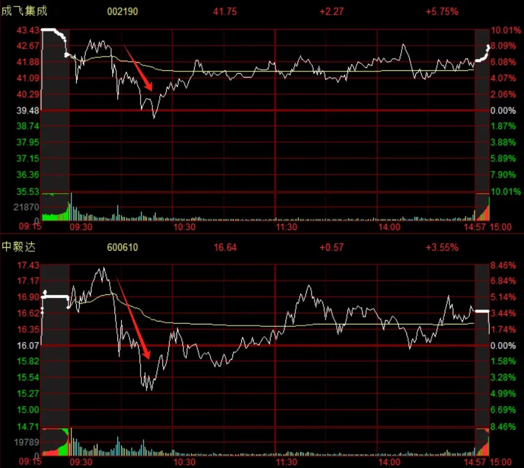 成飞和中毅达也冲到了9%附近,但这里加速是市场忌讳的,所以封不上板就被砸了。