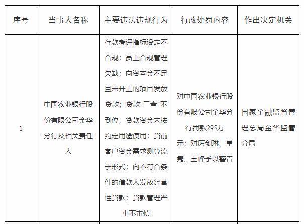 台海网7月17日讯 根据国家金融监督管理总局网站近日发布的行政处罚信息公开表显示实盘炒股配资,因存款考评指标设定不合规;员工合规管理欠缺;向资本金不足且未开工的项目发放贷款;贷款“三查”不到位,贷款资金未按约定用途使用;贷前客户资金需求测算流于形式;向不符合条件的借款人发放经营性贷款;贷款管理严重不审慎,国家金融监督管理总局金华监管分局对中国农业银行股份有限公司金华分行罚款295万元;对厉剑琳、单隽、王峰予以警告。