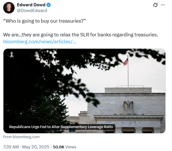 此前,美国五名共和党众议员联名致信美联储主席鲍威尔,呼吁有针对性地调整SLR制度。周二,前贝莱德基金经理、资深华尔街投资人Edward Dowd表示,谁来买我们的国债?是我们自己……他们打算放松针对国债的SLR监管,好让银行来接盘。
